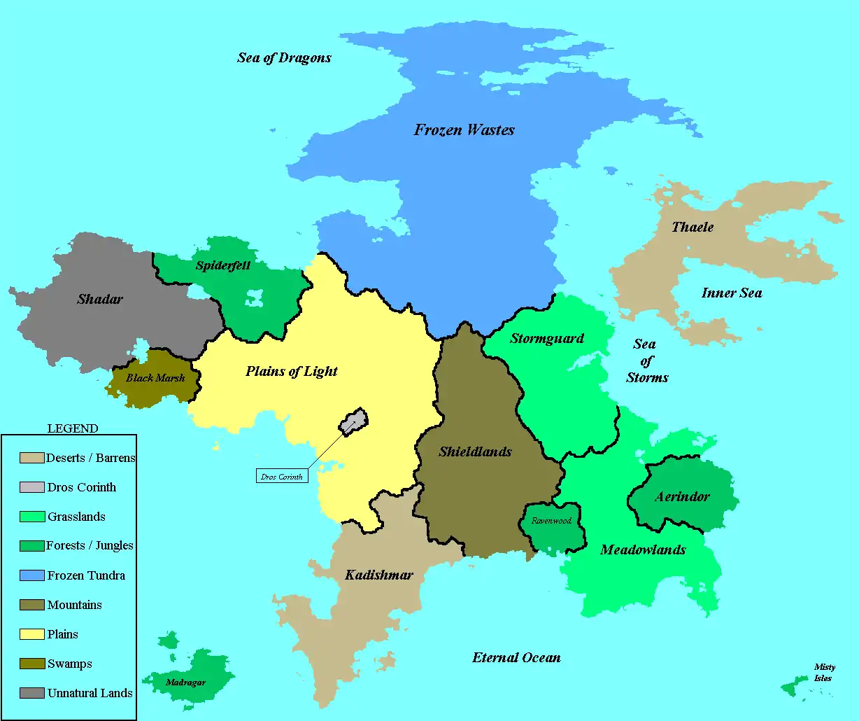 In the north lay the Frozen Wastes. Off the northeastern coast rests Thaele homeland of the Minotaur empire. To the southwest of Kadishmar lies Madragar jungle home to many species of the Lizardfolk. To the far southeast close to the edge of the Storm rests the Misty Isles home of the Seafarers.