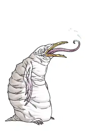 The albino penguins are a race of exceptionally large penguins that stand as tall as a human or slightly more. After millennia of life underground, the eyes of these creatures have all but disappeared and their feathers turned white. However, albino penguins have exceptional senses of hearing and smell. Some say that albino penguins have been created by the Elder Things as livestock. |