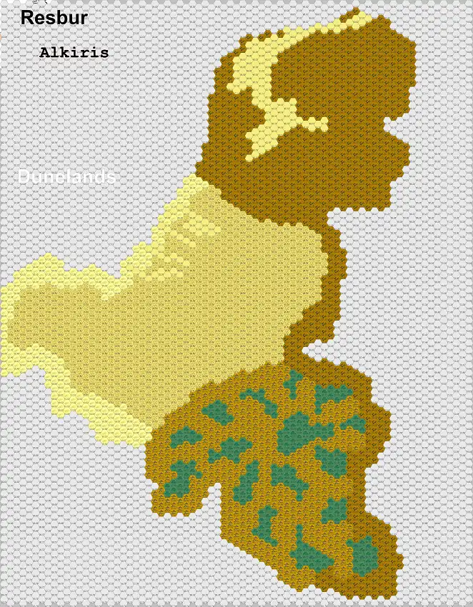 Alkiris is located on the sub-continent of Resbur, and is home to many nomadic tribes. There are many sand and rock related creatures and large trained Bulettes. There is almost no rain in Alkiris, the only place that receives any rainfall is the Southern Jungle. The summers are blistering hot, and the winters are hot.