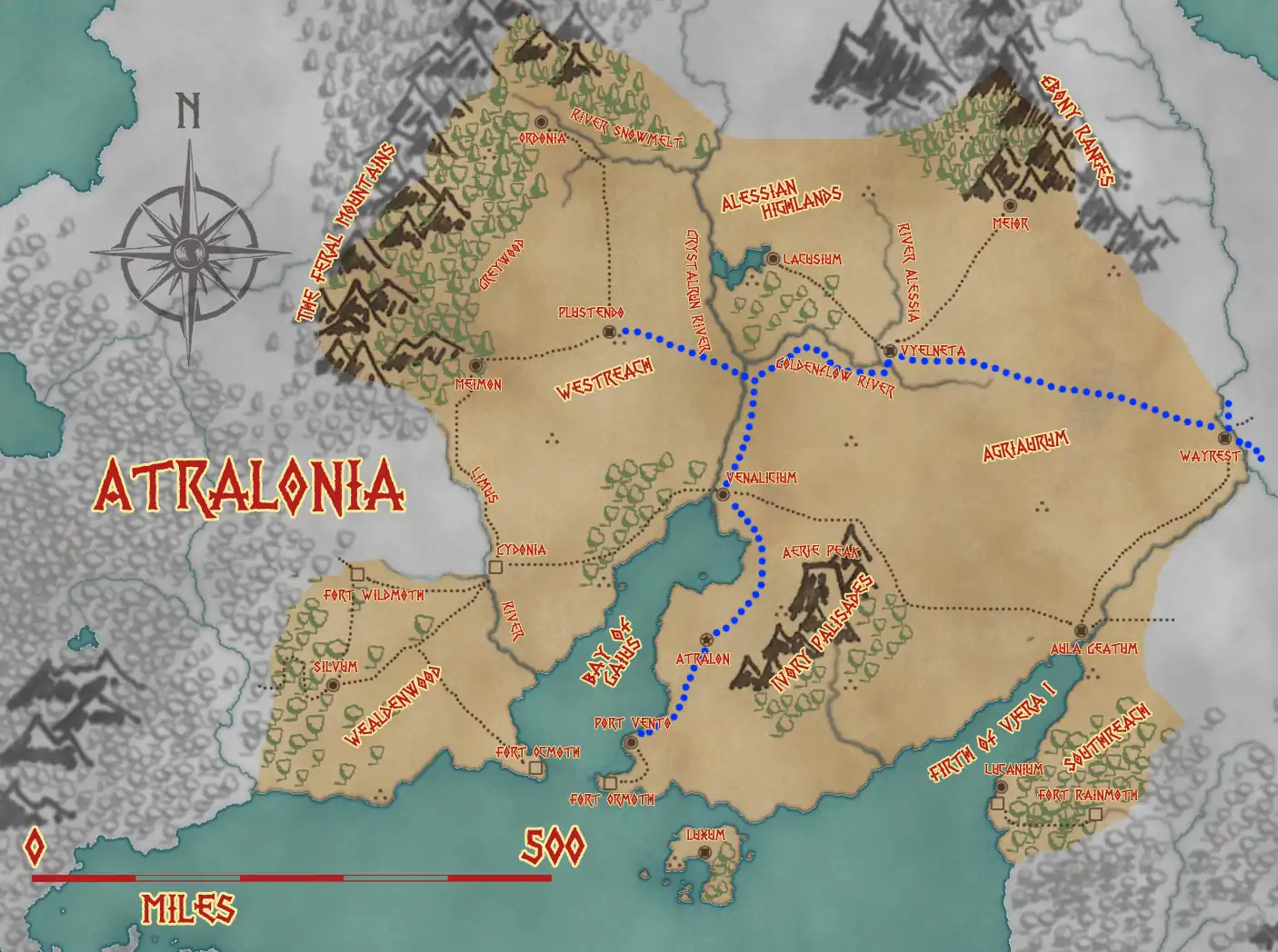 The lands of Atralonia stretch from Cydonia in the West with its wilderness frontier and constant sorties with the monstrous races to Wayrest with its access to the Stridflow river in the midst of stretching pastureland in the east; from Lacusium with its grazelands in the Alessian Highlands in the north to the bustling naval market of Port Vento in the south. There is a successful road system completed by Empress Camilla I in 4e 43 that stretches across the entirety of the Empire, and a highway reaching abroad as far as Ersatis completed by the Dark Empress Galvene Llothri in 4e 216. It was a substantial milestone in opening up lucrative trade with the Dunmer.