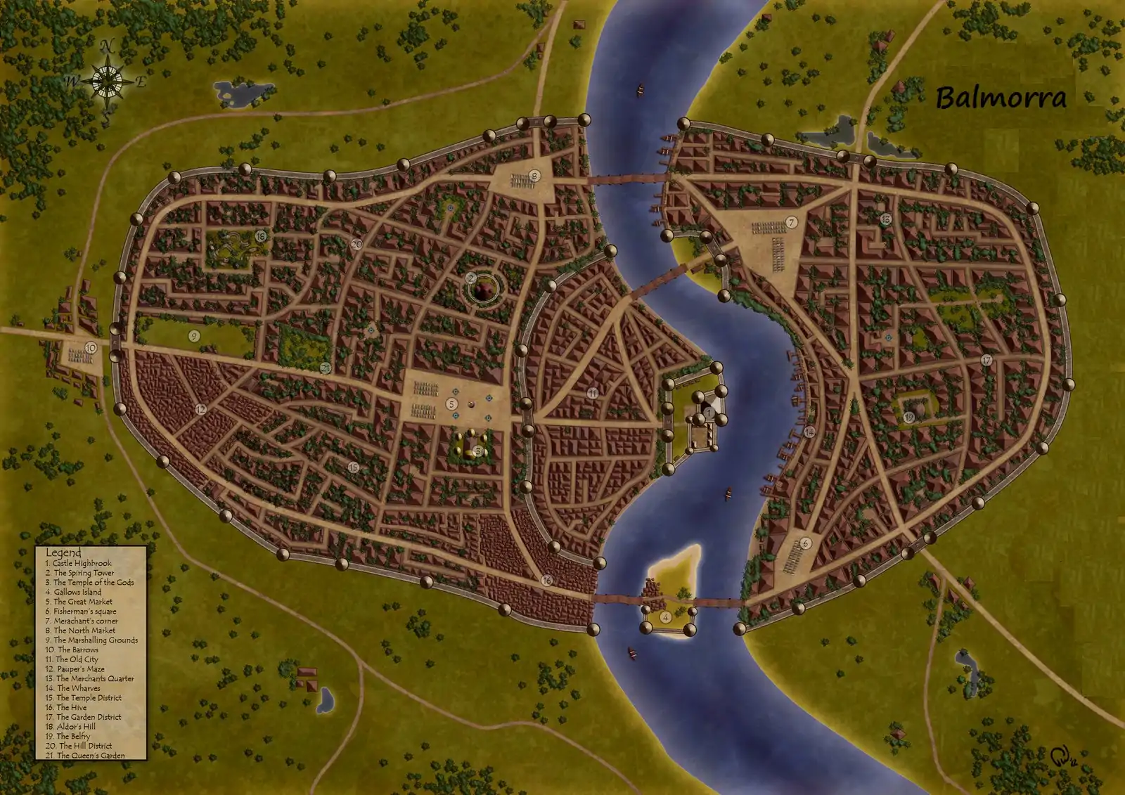 Balmorra sits astride the Melidaa River, built on both banks of the mighty waterway. Four bridges and a warren of docks impose themselves on the river and facilitate trade in all four directions. The Starnas have long held the city, since the days of the 'Middle Kingdom'. Their slate green banners hang from the city's gates, and statues of their storied heroes stand in squares and small courtyards throughout the city. Their forms, some new and fresh and some worn to the point of anonymity give mute testimony to the deeds of the Starnas. The city is impressive, but more subdued than Ak'kritaar. The buildings here are stone, but raise no higher than three stories outside the walls of the ancient fortress. Trees sprout up throughout the city, and patches of green exist within the well built up city. The city was never centrally planned, so it grew up winding its way between the low rolling hills of the area and eventually connected over the top of them. The people live in close proximity, and houses of stone or wood butt right up to each other. The city's main boulevards are as grand as any other, but once off those Imperial roads the city takes on a closer, warmer feel. The walls are stout and thick, but show an age that will put off the ignorant and gain the respect of the knowing. The city has not fallen to an enemy since the fall of the Middle Kingdom: the Starnas have since defeated or made peace with every enemy they've faced for centuries.