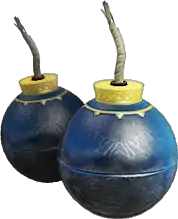 A typical bomb in Hyrule is spherical, between 6 and 12 inches in diameter, and usually a black or blue color. It automatically lights when it is pulled from its satchel, but requires two hands to throw accurately. A Hyrulean bomb is built from a material other than gunpowder. Its explosion creates great blunt force and noise, but little flame or heat.