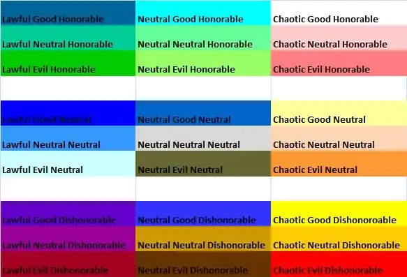 Instead of a two dimensional chart of Lawful to Chaotic and Good to Evil, add a third dimension of Honorable to Dishonorable.