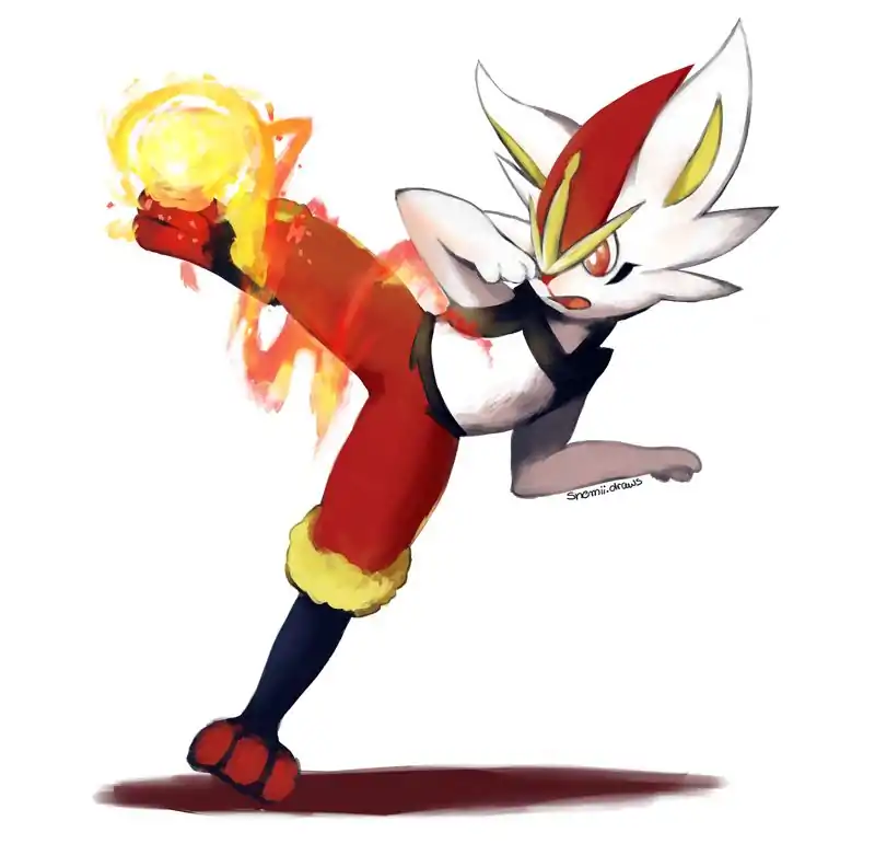 These tall, football enthusiast rabbits start out as small, white Scorbunnies. These bunnies are almost completely white, save for the tops of their ears and their toes which are orange. They have yellow markings on their faces, right above their nose, and on the soles of their feet that seem to resemble bands. Scorbunnies are very energetic, and can often be seen dashing through fields with small fires trailing behind it. Doing this causes the fire energy in its body to start coursing through its body, allowing it to fight at full power.