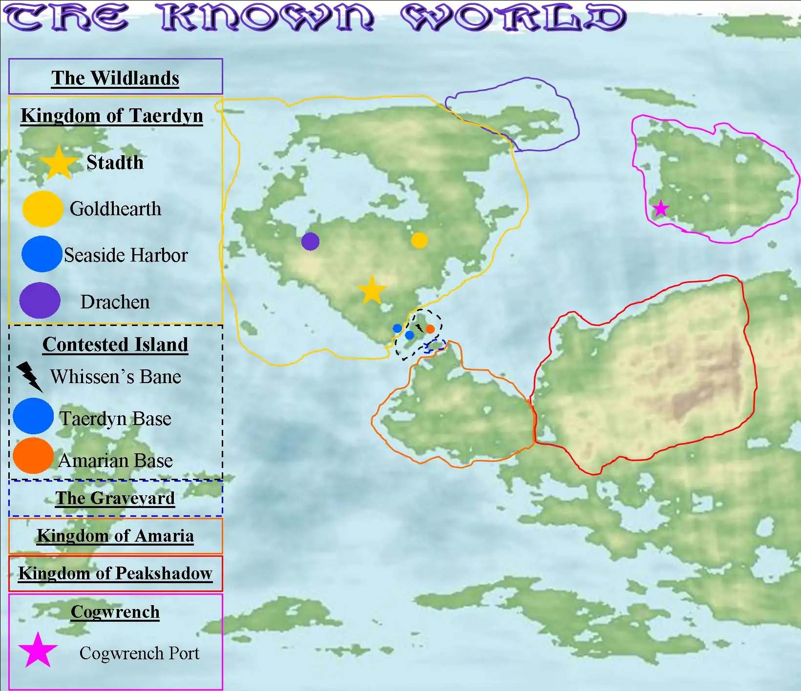 The Contested Island, known by several names depending on what group or government you're asking, is a major source of conflict between countries and organizations in northwest Ailsion. The island lies directly between the small straight, separating the Kingdom of Taerdyn from the Kingdom of Peakshadow, and both kingdoms keep bases with continual fighting for control of the island. Southeast of the island is a smaller island between it and Peakshadow, known as The Graveyard, known to be a source of odd happenings and avoided by common travelers.