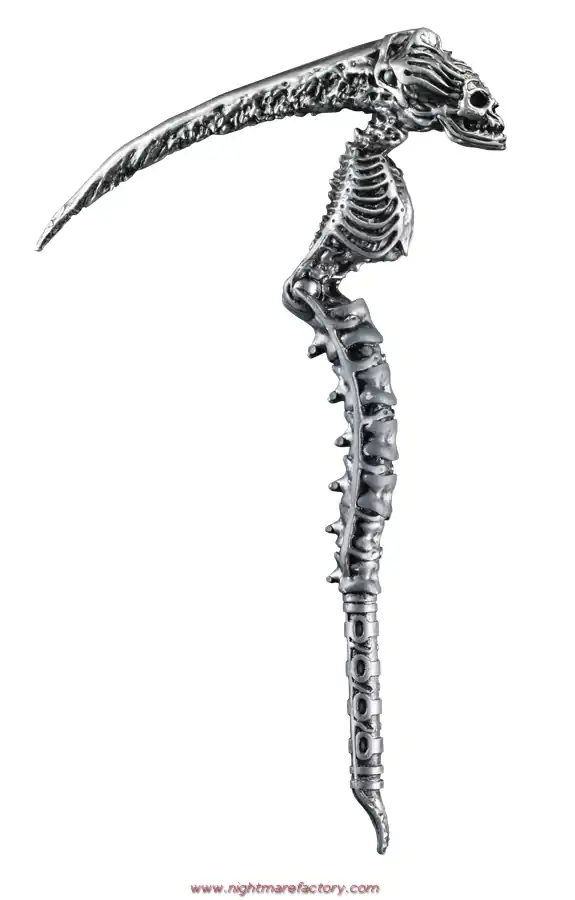 A spiritual weapon crafted in the deepest part of hell for an old man named "Grim", this Rosewood cane has a carved ebony skull head and was bathed in the river styx. Using the concentrated evil energy from the wielder, this cane can change forms, developing a large bloodstained scythe blade and a longer shaft with 5 ruby orbs embedded. A non-evil character holding the scythe or cane incurs 5 negative levels until such time as that it is discarded.