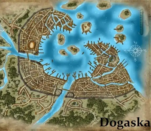 Dogaska, the City of Swords, clings to the hills of Eposa Bay in much the same way its inhabitants and denizens cling to the Sword Coast. The three peninsulas that form the city run up the slopes to the ancient and crumbling barrier walls, which in turn look over the always crowded wharves and bay of Dogaska. The City is a constant hive of barely contained activity. Smugglers and pirates frequent the city, as do mercenary commanders and criminals of all types. At any given time the bay is a menagerie of ships and cargoes. Sights and sounds and smells from every corner of the Narrow Sea assault the senses and ships towing prizes clog the waterways on their way to the famous ship auctions and slave markets. The city that watches and endures this hive of activity is ancient and patched up, and a mess of activity at all hours. Some parts of Dogaska have been renovated and are well kept up by powerful merchants and captains, but these walled areas are islands of decadence in a sea of chaos and depredation. Almost all of the city is given over to apartments, inns, taverns, casinos, brothels, markets, and everything else needed for the care and feeding of a thriving underworld. The city produces literally nothing of its own. The farms and villages nearby are abandoned and overgrown, and those that are occupied are bases for some group or cult, or hubs of heinous activity frowned upon in this city of pirates.