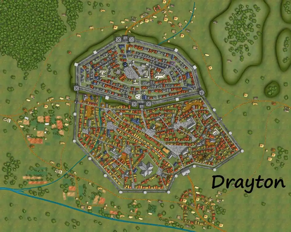 Now that the Dragon's War is over and the Imperium has broken up Drayton is a much different place. The breakdown of unregulated Guild Trade north into Onea alongside the destruction of Jehanna's Rest means Drayton must almost exclusively trade south into Taralon and Balmorra. Additionally, since it's no longer on a bustling trade route Drayton must export instead of trading with through-traffic north and south. As part of this this sharp change in political climate, Drayton faces two large issues. First off with Jehanna's Rest in ruins Drayton becomes a city on the edge of complete wilderness north all the way to the bridge to Nurim's Reach and the old VII Legion Fortress in Onea. House Casseres and the population of Drayton have had to quickly learn how to patrol and control important regions near their city. Many of the forces they recruited and fielded for the Dragon's War still exist, long after House Casseres intended to return to normalcy, and patrol the reaches to their north. The second issue facing Drayton is the combined economic output of House Latimer in Taralon and House Reave in Reavestone Keep. Both forces are competing with Drayton's output and seek to push the city out of the market.