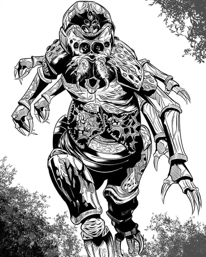 One such fragment of ancient druidic lore mentions a secret cannibalistic tradition. These all-but-forgotten druids embraced vile aspects of nature, particularly the invasive and unkillable virtues of vermin. They indulged in increasingly arachnid practices. What began as living amongst webs and spiders turned into eating living spiders and imbibing venom, and finally taking demon-brewed infusion and adopting arachnid grafts. Eventually these fanatic druids gained a measure of kinship with the arachnids they revered. Thus, in a time long past, when a true humanoid spider came upon their ranks, the druids took its presence as the ultimate validation of nature, seeing the creature as prophet and embodiment that all they held sacred. Over time, these "perfect born" came to outnumber the humanoid numbers of their order, eventually replacing them entirely.