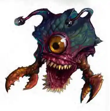 This is a water breathing version of the beholder, and dwells only at great depths, floating slowly about, stalking prey. They have two crab-like pincers, and a wide mouth full of sharp teeth. The primary weapons of the eyes of the deep, however, are their eyes. The creature's large central eye emits a cone of blinding light. The eye of the deep also has two smaller eyes on long stalks, which are used to paralyze prey. |