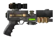 A redesigned, more adaptable version of the Glock 86 plasma pistol, the Gun Runner plasma defender was mass-produced by the Gun Runners for distribution around the west coast, even being sold by competitors such as the Van Graffs. It sports an upgraded magnetic housing chamber powered by two small energy cells capable of creating more devastating plasma bolts.
