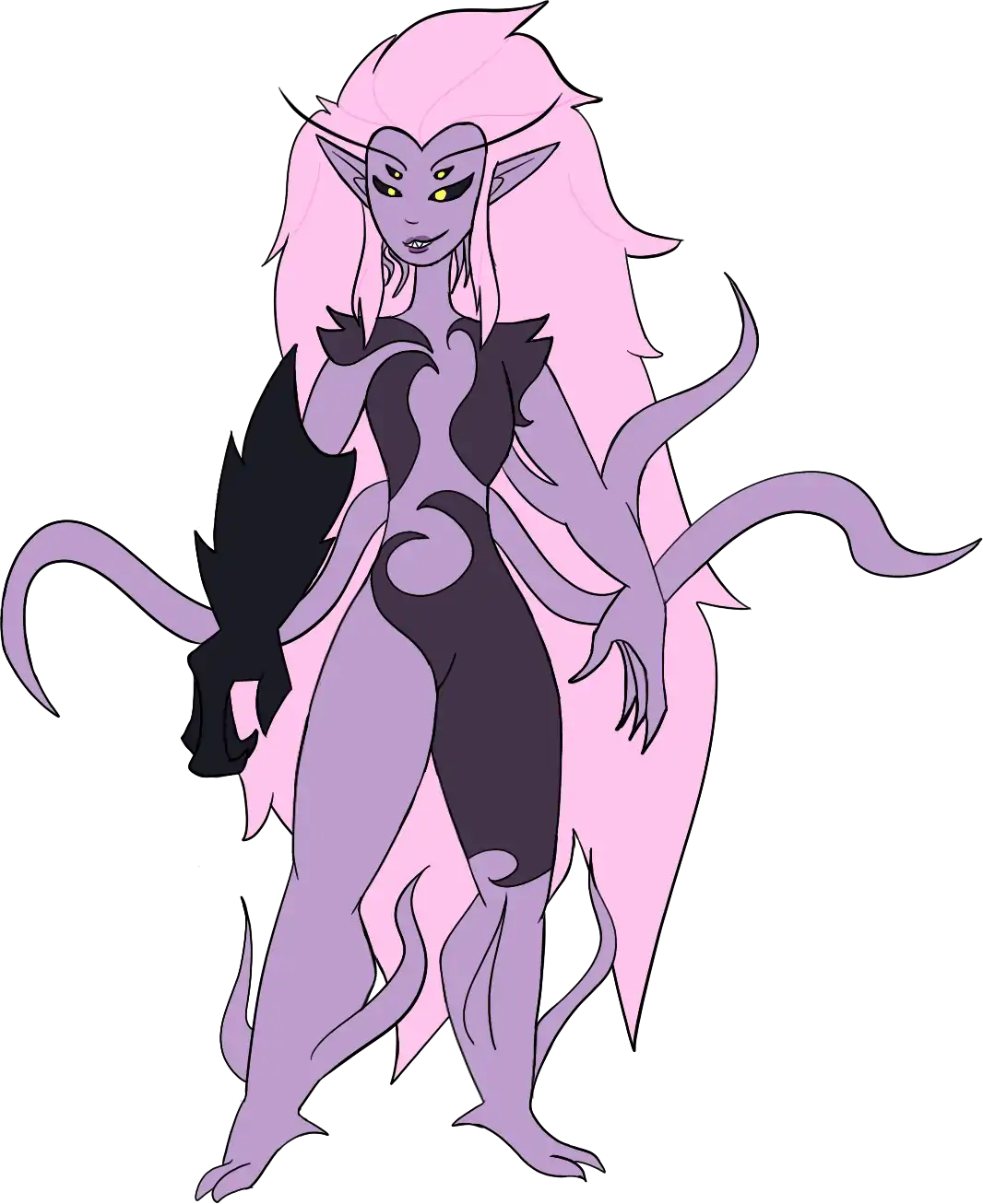 Lithunes are elf-like in shape however they are far from elves. Lithunes have 4 eyes, two regular eyes as other races have, and two smaller eyes above, these eyes allow them to peer into the ethereal briefly. They have small tendrils over their bodies, two on each side of their face, two on each wrist and ankles, one on each side of their waist. They also have a long tongue which can extend up to 3 feet. Their skin varies from pink to purple to blue, their hair is usually a similar color but either much darker or lighter. Their eyes have black sclerae with golden or green irises and slit pupils. It is not uncommon for them to have blue, pink, or purple irises, however. Lithunes have no different sexes, they have the reproductive organs that both male and female creatures would normally have, some may look more masculine or feminine but this has no change on their reproductive organs.