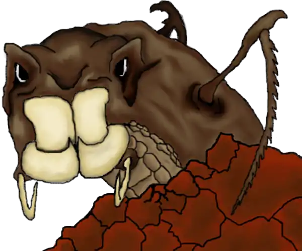 Out of the ground emerges a huge tanned-brown worm-like creature with insect legs. It's mouth has four large teeth obviously used to burrow. Two stingers are on each side on its teeth and they drip with acid that makes the rock mushy when it makes contact. The creature rears up and then burrows towards you with full momentum.