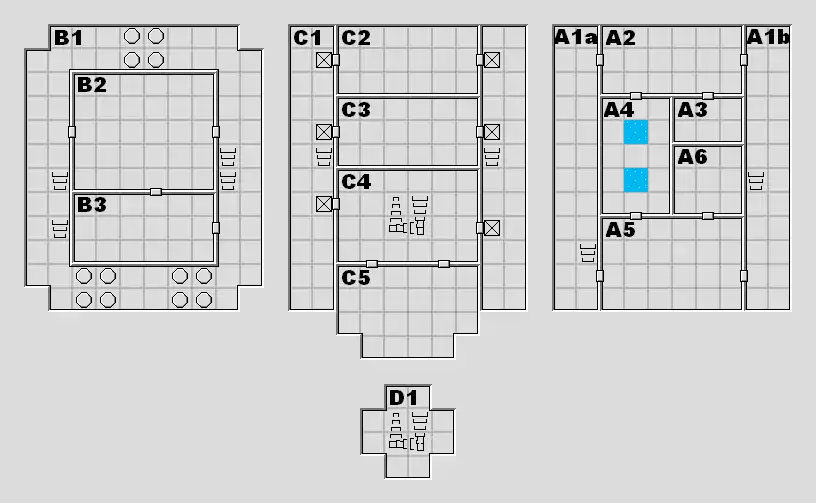 15ft.-by-25ft. room, 8ft. high. All doors unlocked (hardness 5, 10 hp). Two iron grates on floor (B2, D2), with three bars in each (Escape Artist DC 25 to push through, Strength DC 25 to bend). Two water elementals keep the room and the grates clean and stop the water from flowing in; they attack intruders from the water on sight, letting the water flow into the room. It takes a full round for the water to be deep enough for the elementals' water mastery to kick in, and the high thresholds on the doorways keep the water from flowing over (at least somewhat).