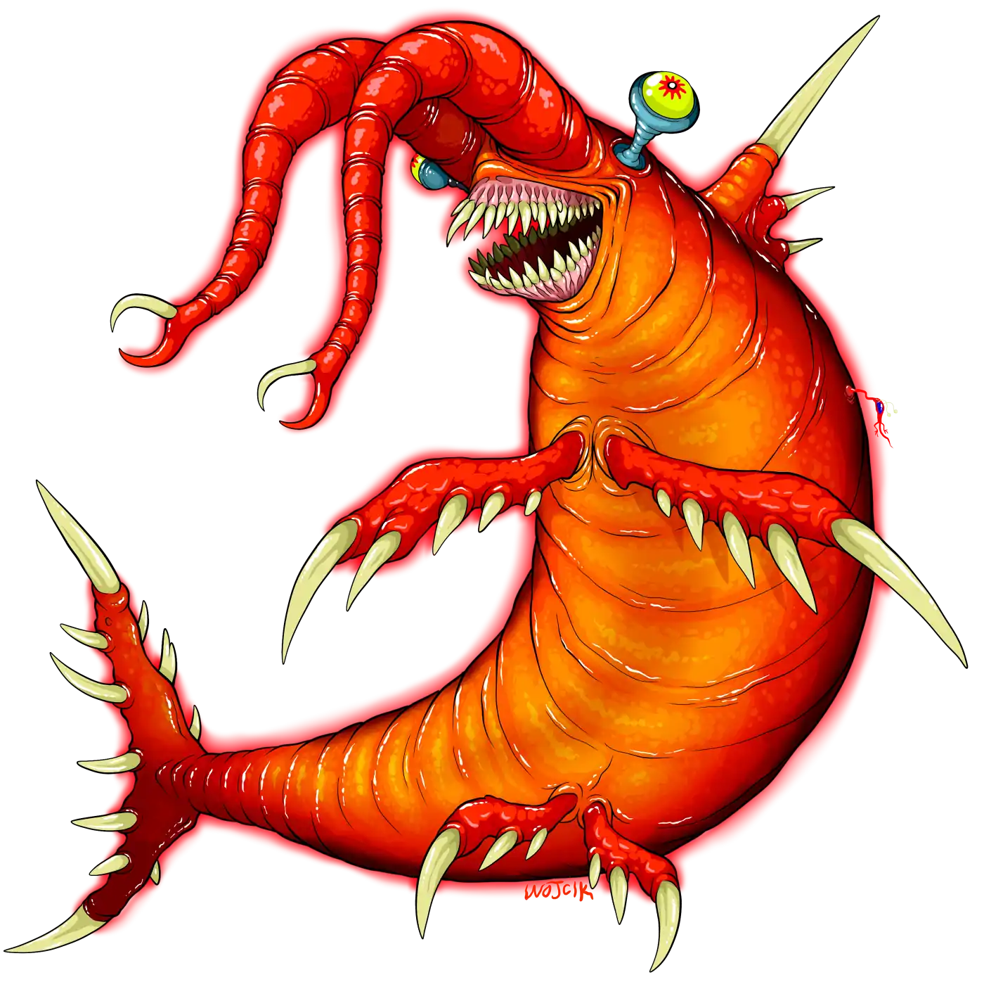 The ghost of a long-dead predator. Easily among the largest of all known living (or once living) creatures, the monstrougeist is thought to have been a global apex predator during its original lifespan. Easygoing and fearless, the monstrougeist spends its entire existence drifting in and out of consciousness, its enormous form bobbing sleepily below the ground with only its eyestalks exposed. It seldom needs to expose more than its cranial "great appendages" and jaws to consume most meals, but enjoys circling and stalking prey for extended periods of time, displaying its dorsal spines and periodically leaping from the ground in a terrifying arc. |