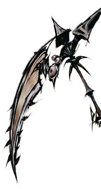 Naiakiss is depicted as a young woman, striking and hauntingly beautiful, covered in blood. She is usually wearing armor and wielding a mighty scythe.