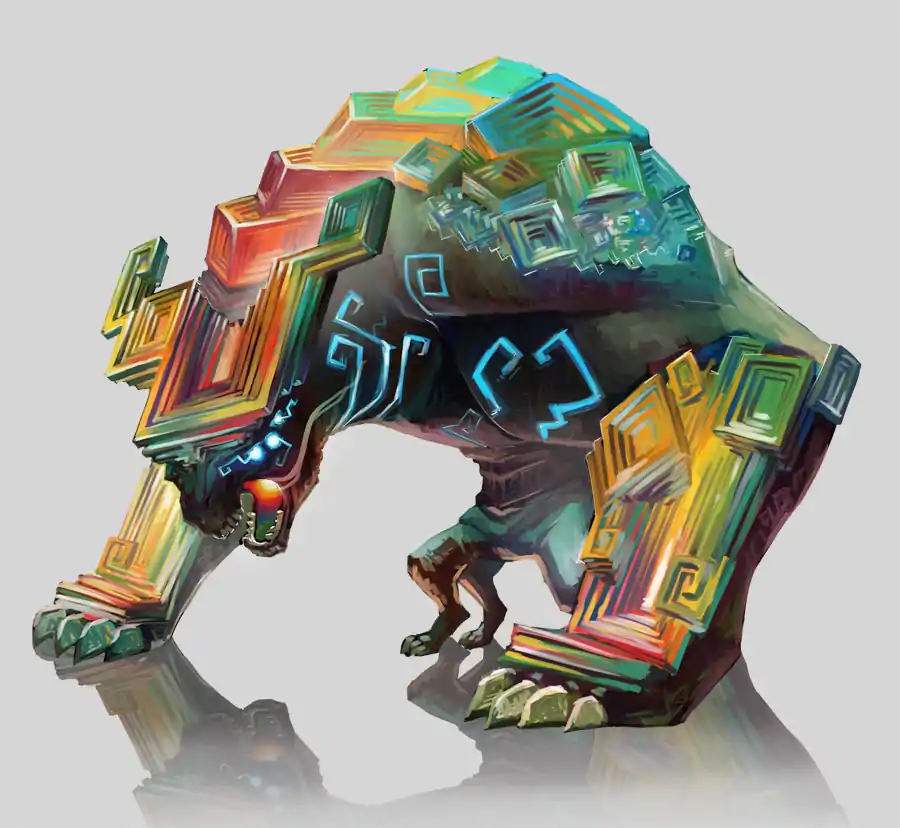 Suddenly, the sound of a raging stampede can be heard coming quickly from down the tunnel, as if some number of creatures have been disturbed and are rushing towards the exit. As the sound grows closer, the vibration of heavy plods get stronger, causing you to grip the hilt of your weapon amid a mixture of fear and anticipation... before it is upon you. A massive hulking creature, crowned in a mineral-like headdress of dull, earthen rainbows, comes barreling through the darkness, loosing a fell roar as it charges and smashes into your allies, tossing them aside violently. As you try to flank the creature and provide relief, it freezes you with a glare of its bright, white eyes, seemingly sparking with power, before a terrible pain wracks your mind.
