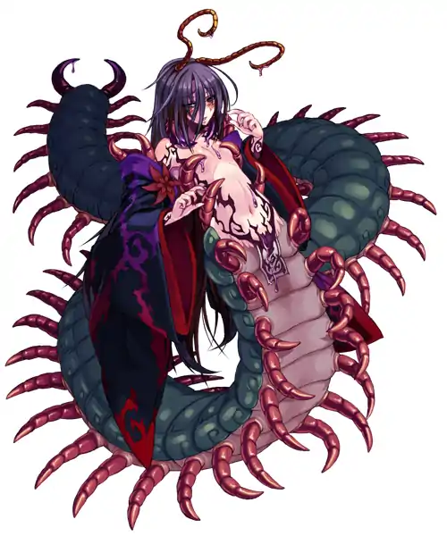 A monster having the lower body of a centipede and the upper body has the form of an alluring beauty that gives off a dark impression.