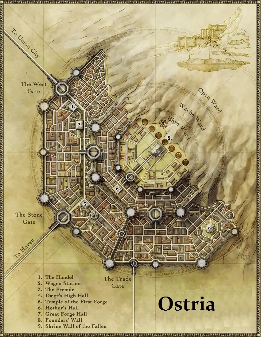 Ostria is laid out in a semi-cirlce that's a bit more than 180-degrees across. To the south and south-west lie open plains that lead down to the sea about 3 or 4 miles out at the closest. This land is covered in farms and a few scattered farming or fishing towns. To the west the road leads out west and then north and the ruins of Nathan's Rest, a satalite mining town, lie on the outside of the curve. To the northwest lies more farmland along the valley that leads to Tallins, and to the north lies the glacial Lake Ostria. Ostria's lowest tier has three gates - the Sea Gate (south southeast), the Donkey Gate (southwest), and the King's Gate (due west on the road) - and opens into a port onto Lake Ostria. A steady flow of farm goods, fish, and trade comes in from Lookout Point; and mining goods are starting to flow in again as Nathan's Rest is rebuilt. The Lower level of the city is bustling with trade and people from all over Beldron looking to make a few gold; the city's markets are second only to Visserene. The port area of the lower tier does a good trade in fish and in peacetime it gives Ostrian merchants access to the Narrow Sea via canal.