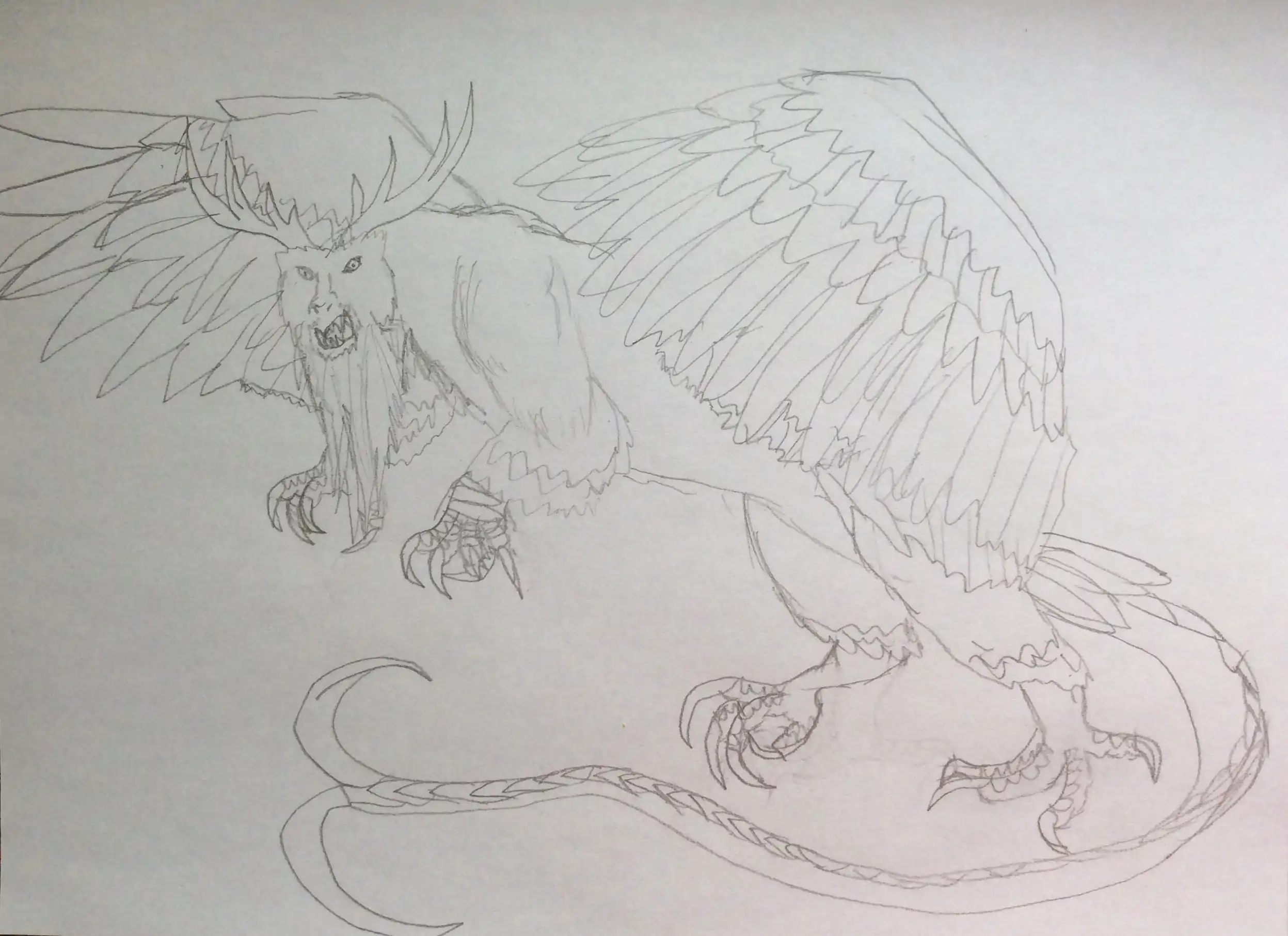 A piasa is a close relative to manticores, with a vaguely humanoid head, and a spiked tail. However, piasa has only two that cannot be used as a ranged weapon, a long beard, large elk-like antlers, jutting lower canines, muscular, avian wings, and long, eagle-like talons. Predatory Evil. Piasa are killers of many types of prey, and rulers of great expanses of territory. Once they set up shop, their first act is to make sure the local beasts know there's a new alpha predator. They don't see much value in currency, but love to have power over "lesser" creatures, such as humanoids whom they will often make them pay tribute to the in meat and even servants. If they are feeling particularly high and mighty, they'll demand sacrifices of children from infants to toddlers, whom they raise to praise them as gods. Beastial Tendencies. With nonhumanoids, piasa are far less negotiating. Piasa use their size and intellect to outmaneuver their foes, which include much of the same creatures as manticores. Though of all the creatures in the world piasas hate, it's their cousins they hate the most. Manticores are never tolerated and are quickly dealt with. Piasa are a fair challenge to a pack of manticores, but if the pack is large enough a single piasa will struggle. But they're not always alone. |