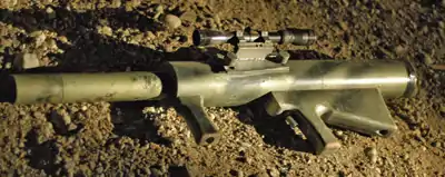 A large metallic tube makes up most of its body, meant to be slung on the shoulder and fired on one knee. It has an eyesight and trigger slung underneath. The classic bazooka, it is a fireball in every shot, but the ammo is expensive, rare, and reloading is a major pain.