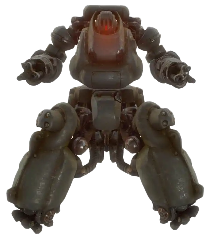 Sentry bots (military serial numbers SB-XXXX) are security robots made before the Great War with the express purpose of participating in the heaviest of firefights during war. Where the Mister Gutsy is a hovering platform with modest armor plating, and the protectron was originally designed for protecting business premises, the sentry bot is a powerhouse, equipped with sturdy armor plating, powerful weapons integrated into its chassis and high mobility, thanks to mecanum wheels mounted on its three legs.
