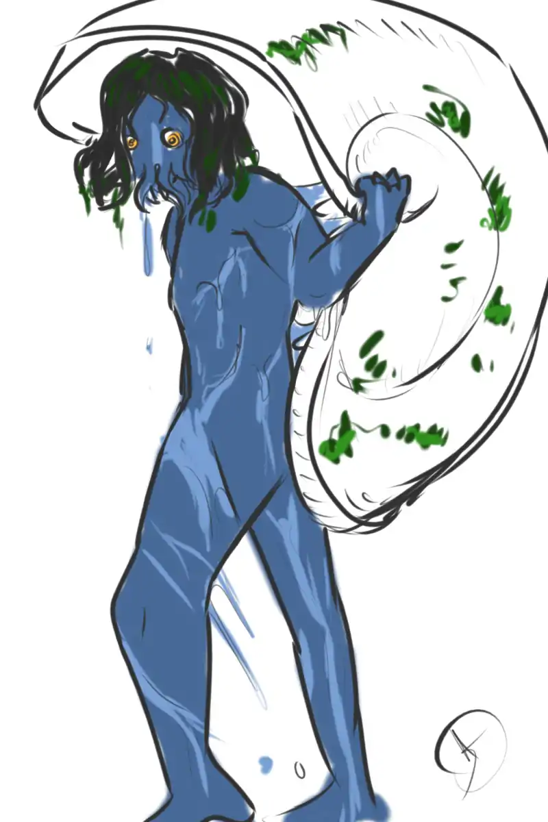 Shellforged resemble vaguely humanoid forms that are housed within a large shell. For females, the shell is usually connected to their bottom half of the body, like a mermaid, only with a shell. Males carry this shell on their backs. Their skin is usually varying hues of violet, blue, and even grey. The shells they carry are very large and vary in shape. Some have scallop shells while others have spiraling conch types. The design on the shells externally are usually dull, but the interiors are very beautiful due to the luster that shellforge excrete. Their faces are usually described to be hideous, with a fringe of tentacles above crab-like mouthparts and googly-eyes. Shellforge hair is usually very stiff and colored with algae, and they have slimy skin.