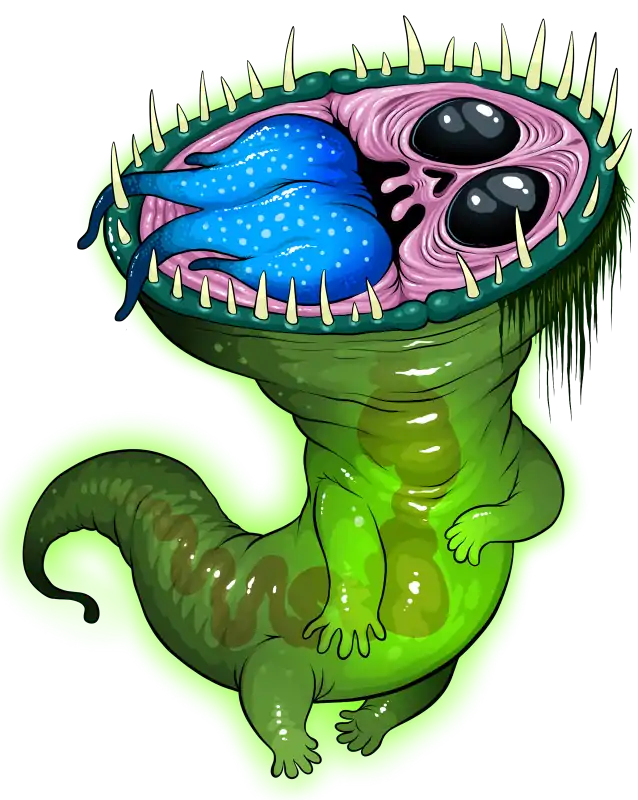 The ghost of a long-dead predator. This patient predator takes full advantage of its ghostly nature as it lies in wait for prey, its "spring loading" jaws spread wide mere millimeters beneath the ground, behind a wall or just within any object large enough to conceal its bulk. When a creature treads within striking distance, the monster releases its tense jaw muscles and solidifies its teeth to clamp shut on the victim like a crushing vice. With the rest of its body still in its hiding place, the snappergeist becomes a virtually immovable trap, and if prey proves exceptionally bothersome, it can deliver several thousand volts of electricity through its luminous tongue. |