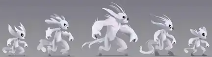 Spirit Guardians are small, white, lemur-like creatures. They come in a diverse range of forms and sizes, though they have common characteristics distinctive of their kind. Common features include two horn-like tufts at the top of their head, long ears attached at the lower back of the head, hands with a single mitten-like digit and an opposable thumb, cat-like legs that end in a white hoof, and a long cat-like tail. Their most definitive characteristic is their ethereal body. Spirit Guardians all have pure white bodies that glow slightly, and their eyes are pitch black with white pupils.