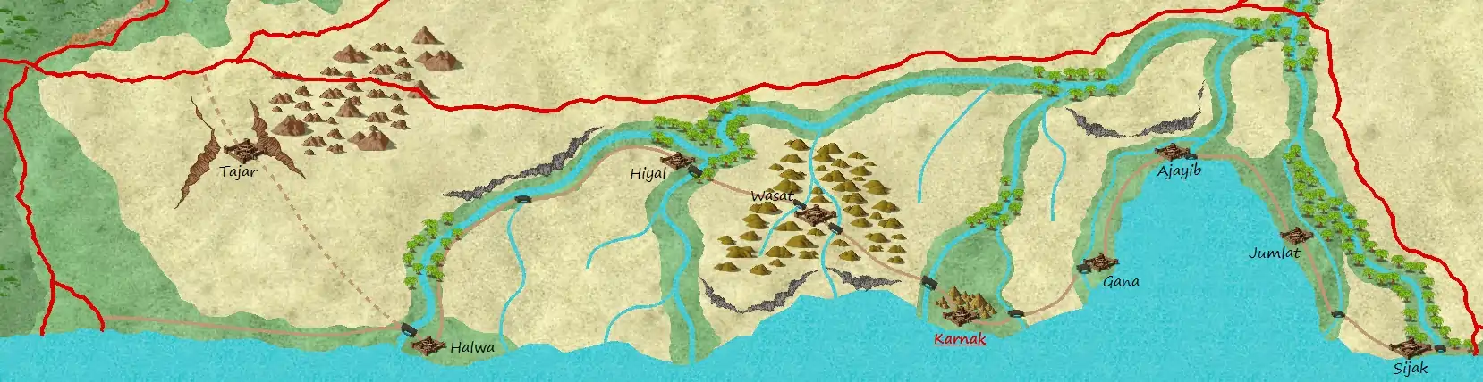 The immense realm of the Grand Caliph, and the center of eastern culture. The people of Suran and Kwazarmia technically pay homage to the Grand Caliph's divine right to rule, but in practice his authority extends to the emirates, sultanates, and houses of the area denoted on the map. The Golden City of Luxor - City of the Gods, a city within the metropolis of Karnak, is his realm and from there he reigns. For nearly 2000 years, ever since the reign of the Grand Caliph Suzerain, the Caliph who sits in Karnak has ruled with the authority and by the grace of the eastern Gods. His word is theirs and he acts according to their wishes.