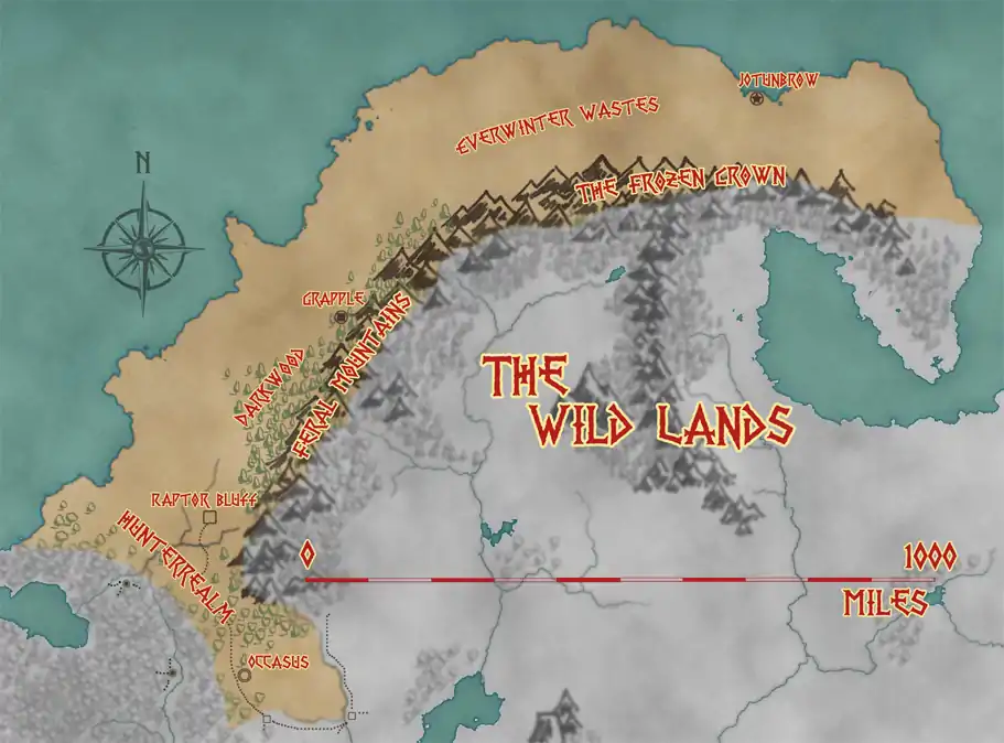 The Wild Lands are actually dozens (if not hundreds) of small kingdoms of monstrous races, men and mer in exile, and unclaimed wildernesses. It is a vast land that--for a variety of reasons--has never known a single ruler, though some kingdoms have lasted for far longer than others. In the south of the Wild Lands there is almost no cohesion of any kind, with the exception of the outpost at Raptor Bluff. This city of some 4000 souls sit atop a 200 foot tall mesa, and is home to the most legendary hunters in history. These southern lands are filled with monsters of all kinds, and men, mer, and feykind from across the world will journey here to hunt them and claim their pelts or hides as trophies. Perhaps not surprisingly, the Bosmer--who have forsaken the use of metal in any fashion--have steady trade with this region in exchange for alternatives to heavier armor, such as dragonbone plate and the like.
