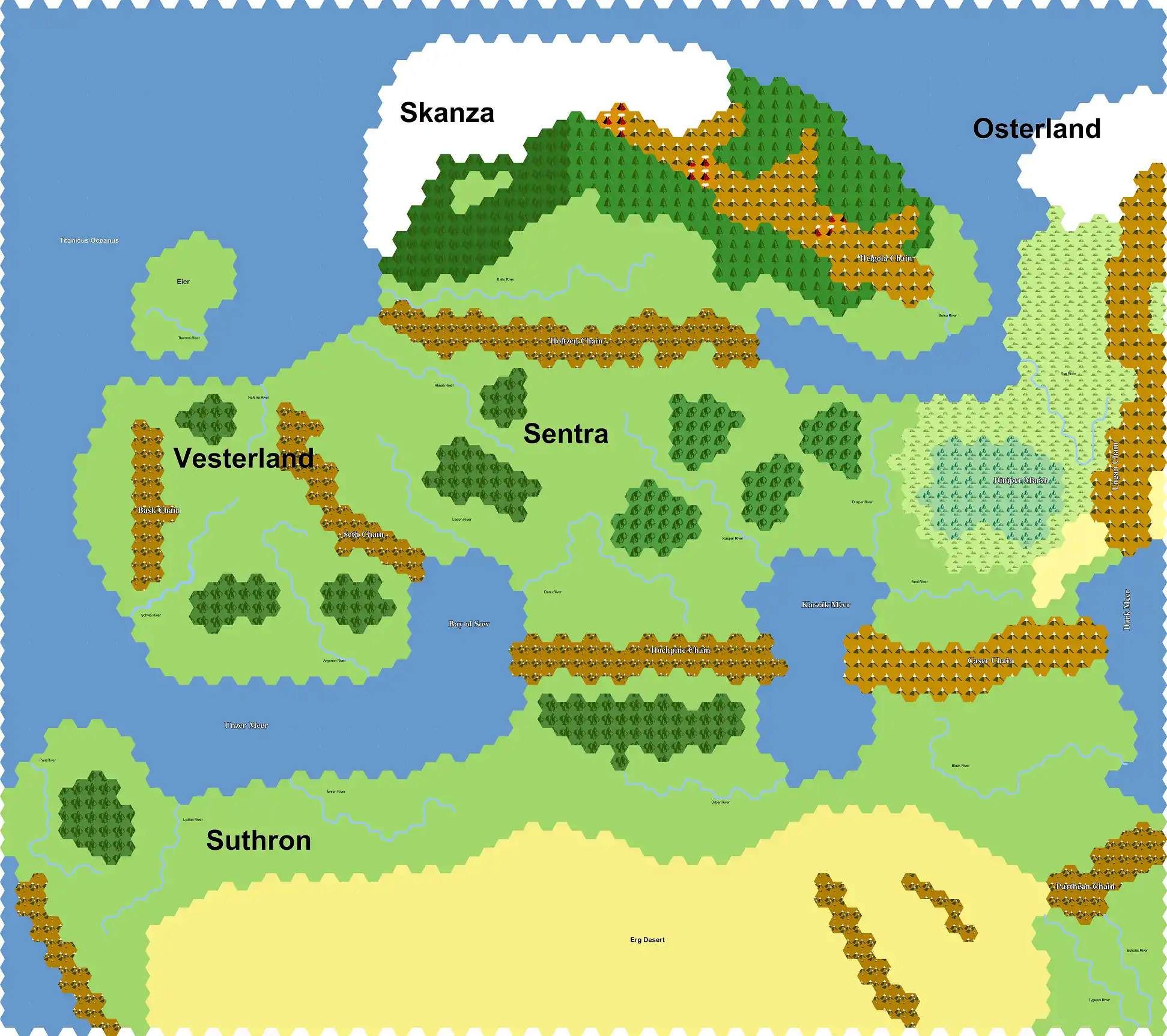 Everything east of the Leeon and Rheen Rivers, south of the Holtzen Chain, north of Hochpine Chain, and west of the Diniper River is known as Sentra. This place is the center of the known world and has the both the highest urban centers and forest reservations. The people here either use the Leeon, Rheen, Danu, Kasper River for farming in much of the realms. That means many of the cities are also located along these rivers as well. Deep dark forests where Elves dwell also exist all over the realms of Sentra, non-Elves should be careful when venturing these places as the locals might have a kill-first-ask-later policy. It is also important to know that the only major overland trade routes into Vesterland and Skanza run right through Sentra. The fact that so many cities exist in a dense manner relative to the rest of the Continent means the highest craftsmen production is also located in the central realms. Sentra's location also means that it has the most different amount of cultures and races as well, especially considering that the Humans tribes migrated from the east while some Elves moved in from the north and Gnomish mountain tribes were displaced in the south.