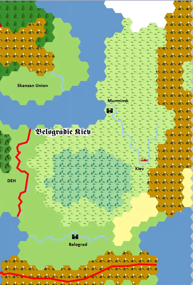 To the east of both Kiev and Murminsk is the Diniper Marshes making up most of the center of Osterland. These places are a natural deathtrap for most people except for the natives who dwell there like some Humans, Elves, and Gnomes. Of course, the marshes isn't a good place for farming or for much anything else that matters. That also means that the local population is always low compared to the rest Osterland not counting the northern Ungan lands. But if one keeps going further west there is plenty of farming land to exploit outside of the marshes. The bordering lands between Belogradie Kiev and the D.E.H are marked with the natural line of the Diniper River dividing the two realms. In fact, most of the bordering lands along the Diniper was once an independent kingdom called "Tallia" until both the Imperials and Kivens cut the realm in two recently.