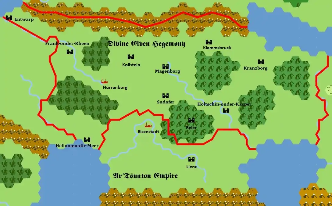 The lands of Sentra is made up of only two states, those very states also both happen to be empires as well. The northern half has the Divine Elven Hegemony while the south is ruled by the Ar'suaton Empire. The Holtzen mountains in the far north effectively separate the DEH from Jutmark as the natural borders. The eastern border is marked with the Diniper River and would mean entering marsh territory beyond it. To the west is the border with Occitonia where the Rheen and Leeon River along with the hill lands make up the borders with the Hegemony. Entisch Human tribes would found the city of Enwarp which now sits along this eastern border with marshes all around it. The southern border seems like an arbitrary line drawn on a map unless one remembers that many Dragonborn peoples settled along the Danu River after migrating from the east. Helion-en-der-Meer is also located near both the eastern and western border as it is the only southern coastal city within the DEH. Strategically placed to be a trading hub, the original Elven founders had in mind to ship goods to Barcerlon and beyond, this also means both the Occiton or Tsunon have tried to take Helion-en-der-Meer before.