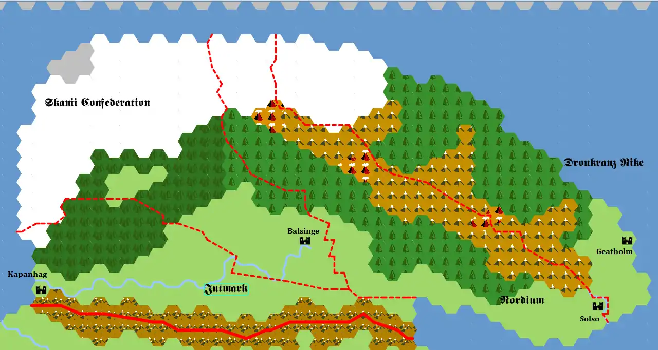 In the east is the much smaller river of Solso which the former capital of Nordium, now the Skanzen Union's capital, the city of Solso was built next to. Called officially "Solso City" but more commonly called just Solso or Solsoborg, it sits right next to the river which provides much of the domestic food production for the Norden population. It would serve as the natural border, before the Norden invaded that is, between the former Provinces of Nordium and the Droukranz Rike. The peoples of the Norden's east are their rebellious cousins called the Geatisch who have formed their own realm. Literally translating their kingdom's name as "Three-Crowns Realm", the original Geatisch believed that the name sounded majestic compared to the utilitarian Jutmark or Nordium, meaning "Jutisch claimed lands" and "land of the Norden" respectively.