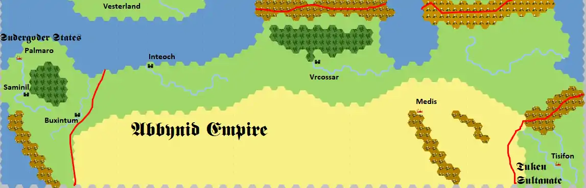 In the sandy lands south of the Silber River is commonly thought to be useless and irrelevant until the city of Medis unified the warring desert city-states to conquer what would become the modern Abbynid Empire lands. These cities built on oasis would exploit the technologically inferior tribes along the Silber River, the 2nd Parthean Civil War, and the disunified petty kingdoms along the Holy Coast.