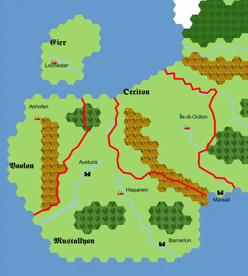The first of the western states to exist in Vesterland is the Kingdom of Occiton, which literally translate "Westerners". This kingdom is famed for the wine and knights with an air of majesty that even lowly peasants have. It used the natural borders of the Rheen and Leeon River and some of the hill lands to mark the frontier between Occitonia and the DEH. There is also a bordering Elven reservation on the Imperial side which is used to smuggle goods across the border if one was avoiding tariffs or moving contrabands. Both the Leeon and Rheen River have many smaller rivers branching off of it provide a constant supply of mineral-rich soil for fertile farming. That also allows the Occiton to have a population boom back 400 years ago when their realm was stabilizing. The Seth mountain chain also existed within Occiton borders to act as the natural barrier to the Grand-Duchy of Mustallyon. Over on their western border exist the Naferra and Argonon River, which also acts as the natural boundaries between the Occiton and the Lyonese. These rivers also provide even more farmland for the kingdom to exploit in the form of additional taxpayers in the borderlands. Ill-di-Occiton is the capital region of Occitonia where one of its ever-shifting capitals are located. As you see, every time the monarch dies, the heir usually moves the capital to a new city within that region. Now, the entire region has become interconnected cities where all of them were the capital at some point in history. Marsail, on the other hand, is a much older city which was founded then abandoned then inhabited again for more than 2000 years.