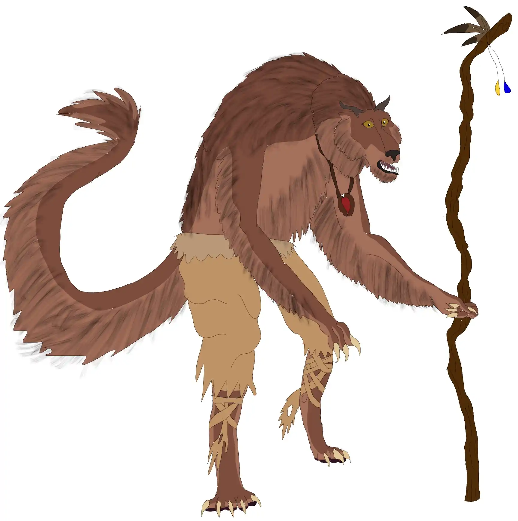 Their shoulders are hunched and look freakishly large due to the coat of long, shaggy fur covering their entire bodies. A long, equally shaggy tail comes out from their rear and ends in a lion-like tuft of fur. Their arms are long and almost ape-like, except that their hands have only three fingers, not four, and are clawed. Despite looking incredibly vicious, their claws are mostly only used as weapons against small animals and are largely used to help in climbing.