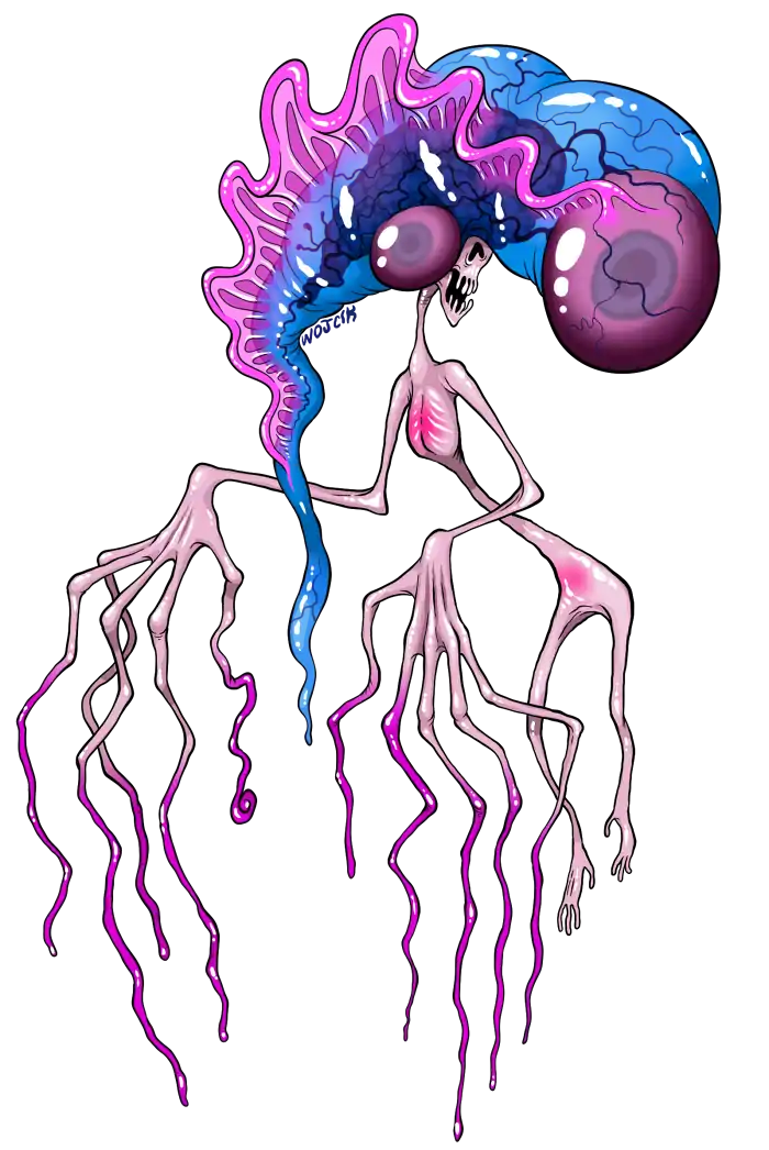 Created by an evil ocean-dwelling race to capture and subdue prey, the boneless, rubbery digits of this vaguely humanoid monster can stretch several dozen feet when relaxed, each lined with millions of venomous nematocysts. The sting of the waroman is excruciatingly painful and immediately paralyzing, allowing the surprisingly strong tendrils to drag still-living prey within reach of the creature's tiny but powerful jaws. Its bloated, hollow cranium is filled with an extremely buoyant gas, allowing it to float through air or rest on the surface of the sea as it hunts. |
