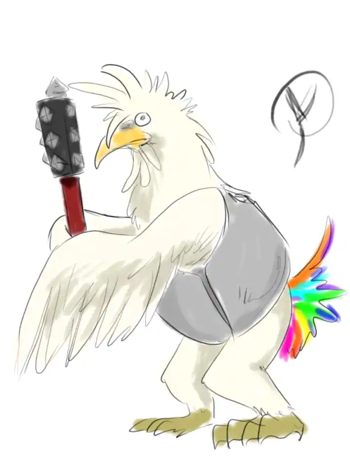 Werecockerels are humanoids whose bodies are covered in white or tawny colored feathers with the heads of chickens or roosters. Their eyes a bit bugged out and sometimes unfocused. They have a particularly fluffy and tall crest on their head like a cockatiel. Their feet are clawed like that of a bird and their arms are wings. On their rump is a sprig of different colored feather tails. They are dim of mind, but are agile and enduring. They are infamous for their uncanny capability to briefly keep fighting even after apparent death, owing to their bodies feeling pain slower.