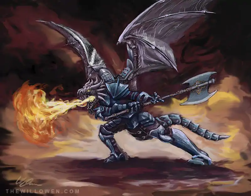 Saving Throws Con +7 Shapechanger. The weredragon can use its action to polymorph into a dragon-humanoid hybrid, into a dragon wyrmling, or back into its true humanoid form. Its ability scores, personality, and other game statistics, besides its size, speed, and AC, remain the same in each form. Any equipment it is wearing or carrying isn't transformed. The weredragon reverts to its humanoid form if it dies. The weredragon can polymorph into exactly one species of dragon wyrmling as its dragon form. Keen Sight and Hearing (Hybrid Form Only). The weredragon has advantage on Wisdom (Perception) checks that rely on sight or hearing. Elemental Resistance (Hybrid Form Only). While in Hybrid form, the weredragon is immune to the same damage types as its dragon form. ACTIONSMultiattack (Humanoid or Hybrid Form Only). The weredragon makes two attacks: one with its bite and one with its claws, tail, or battleaxe. Claws (Hybrid or Dragon Form Only). Melee Weapon Attack: +3 to hit, reach 5 ft., one creature. Hit: 8 (2d4 + 3) slashing damage. Bite (Hybrid or Dragon Form Only). Melee Weapon Attack: +3 to hit, reach 5 ft., one target. Hit: 7 (1d8 + 3) piercing damage. If the target is a humanoid, it must succeed on a DC 12 Constitution saving throw or be cursed with weredragon lycanthropy. Tail (Hybrid or Dragon Form Only). Melee Weapon Attack: +3 to hit, reach 5 ft., one target. Hit: 6 (1d6 + 3) bludgeoning damage. If the target is the same size as the weredragon or smaller, the target must succeed on a DC 11 Strength saving throw or it falls prone. Battleaxe (Humanoid or Hybrid Form Only). Melee Weapon Attack: +3 to hit, reach 5 ft., one target. Hit: 7 (1d8 + 3) slashing damage, or 8 (1d10 + 3) slashing damage if wielded in two hands. Breath Attack (Hybrid and Dragon Form Only, Recharge 5-6). The weredragon exhales powerful elemental energy in a cone or line depending on the type of dragon it is. Each creature within range of this attack must make a DC 11 Dexterity saving throw, taking a certain amount of damage on a failed save, and half as much damage on a successful save. See the creature page of the dragon wyrmling that the weredragon can polymorph into. The recharge time applies to both your Hybrid and Dragon form.