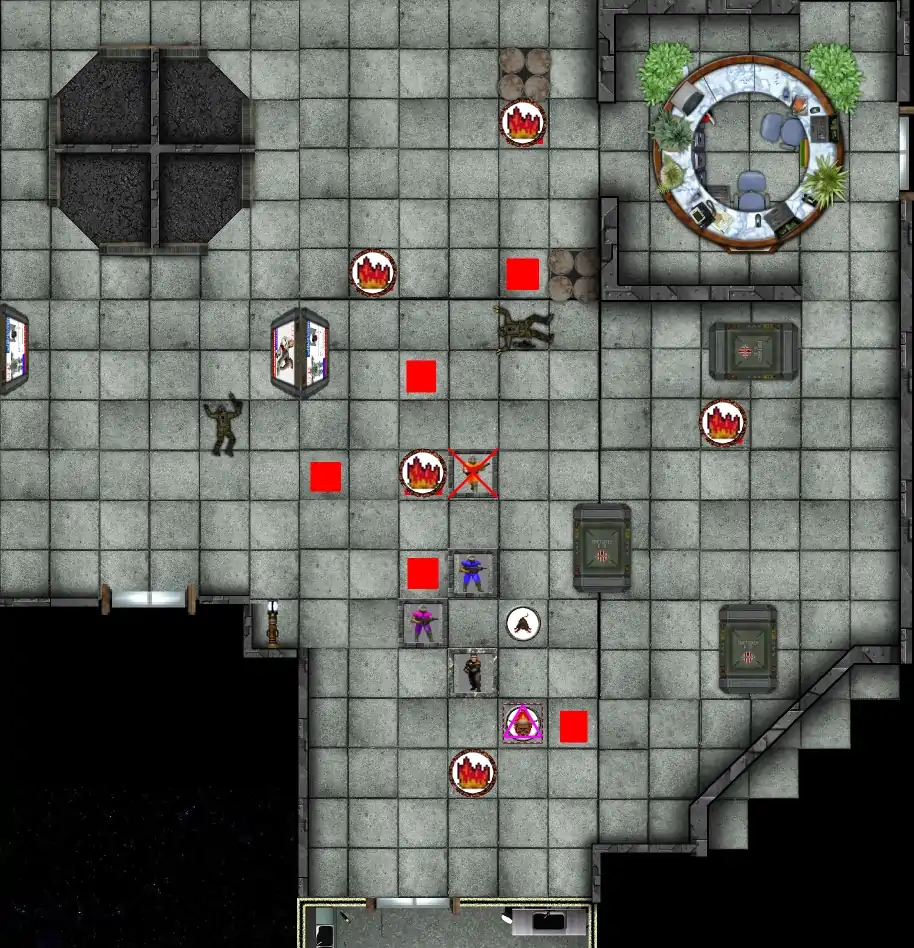 (As you can see I've been busy getting better quality map tiles and tokens. I couldn't find a diagonal door, but there is the entrance to the counceller's office in the diagonal wall to the south-east.)
