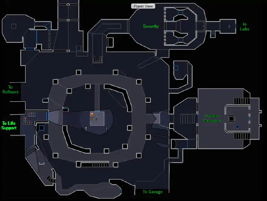 DM. Angus Stafford stumbled out of the prison cell, and finding no guards, recovers his personal gear from an unlocked security locker. Following an overhead gantry, he found himself on the upper balcony ring of some kind of control center (top right on the first map above). The place looks like a riot passed through. [No need for me to repeat myself here, description above :) ]