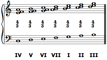Chords of the sixth that take the figure 6/4/2 (or its abbreviation 4/2 or simply 2) are third-inversion chords. Their root is a second, or a step, above the bass. The most common 4/2 chord has fa in the bass, and sol is its root, making its Roman numeral V.