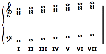 In any chord of the fifth (“root position”: 5/3 or 7/5/3 chord), the bass note and the root of the chord are the same. The Roman numeral to be assigned to any chord of the fifth, then, is the scale degree of its bass note. If do is in the bass, the bass is scale-degree 1, and the Roman numeral is I. If re is in the bass, the Roman numeral is II. And so on.