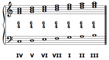 Chords of the sixth that take the figures 6/4 or 6/4/3 (or an abbreviation such as 4/3) are second-inversion chords. They are so named because the fifth of the chord (the second member of the chord above the root) is in the lowest voice. Again, it is often simpler to remember that for 6/4, 6/4/3, and 4/3 chords, the root is the fourth above the bass. If re is in the bass, and the figure is 4/3, the root is sol, and the Roman numeral is V.