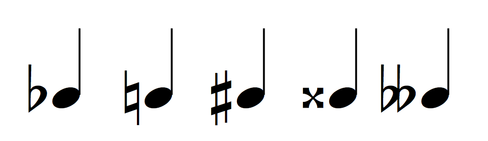The example below shows the symbols for flat, natural, sharp, double sharp, and double flat, respectively.