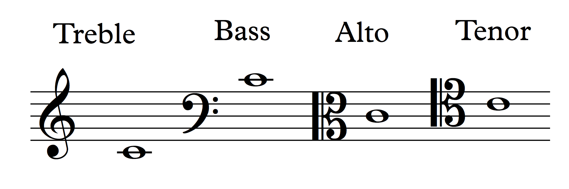 Here is the pitch C4 placed on the treble, bass, alto, and tenor clefs.