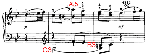 When the music’s range exceeds what can be written on the staff, extra lines are drawn so that we can still clearly read the pitch. These extra lines are called ledger lines. In the example below, From Haydn’s Piano Sonata in G (Hob. XVI: 39), Ab5 occurs just above the treble staff in the right hand, and G3 and B3 occur just below the treble staff in the left hand.