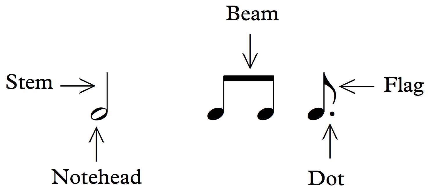 When written on a staff, a note indicates a pitch and rhythmic value. The notation consists of a notehead (either empty or filled in), and optionally can include a stem, beam, dot, or flag.